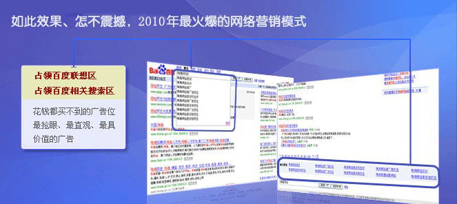 1.百度相關(guān)搜索相對(duì)與百度競(jìng)價(jià)排名具有明顯價(jià)格優(yōu)勢(shì)。競(jìng)價(jià)排名按點(diǎn)擊率收費(fèi),而百度相關(guān)搜索采用包月方式,不管點(diǎn)擊量多大,費(fèi)用不變。