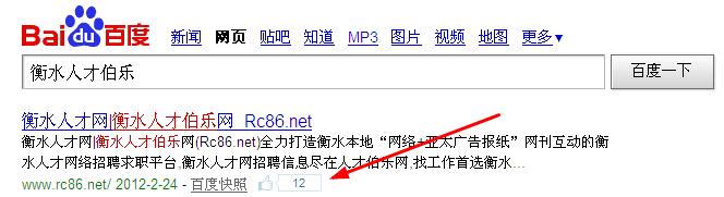 近日,百度進(jìn)行了大更新,此次更新后,很多細(xì)心的站長都發(fā)現(xiàn)了,在搜索結(jié)果中耗子發(fā)現(xiàn)有些網(wǎng)站快照后面出現(xiàn)了一個“多少人喜歡”的大拇指。相信現(xiàn)在有很多站長都在研究這個“多少人喜歡”的大拇指是怎么添加上去的,下面就由我和大家細(xì)細(xì)說來,先拿大成未來的網(wǎng)站,在百度中搜索“衡水人才伯樂網(wǎng)”為例看下圖:
